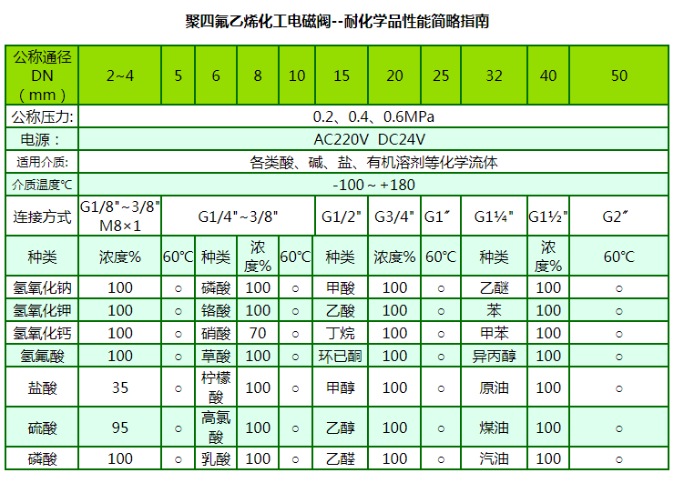 聚四氟乙烯化工電磁閥具有優(yōu)異的耐腐蝕性能,對所有的常用化學(xué)品都呈惰性。幾乎可以抵抗所有化學(xué)介質(zhì)(包括濃硫酸和王水)。具有優(yōu)異的耐熱性能,應(yīng)用溫度為-100~180℃,材料可長期在230~260℃下工作。特別適合腐蝕嚴(yán)重、溫度高且化學(xué)品不允許與潤滑劑接觸的環(huán)境。