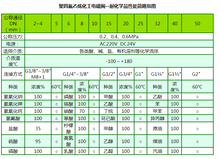 聚四氟乙烯化工電磁閥具有優(yōu)異的耐腐蝕性能,對所有的常用化學(xué)品都呈惰性。幾乎可以抵抗所有化學(xué)介質(zhì)(包括濃硫酸和王水)。具有優(yōu)異的耐熱性能,應(yīng)用溫度為-100~180℃,材料可長期在230~260℃下工作。特別適合腐蝕嚴重、溫度高且化學(xué)品不允許與潤滑劑接觸的環(huán)境。