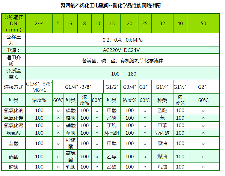 聚四氟乙烯化工電磁閥具有優(yōu)異的耐腐蝕性能,對所有的常用化學品都呈惰性。幾乎可以抵抗所有化學介質(包括濃硫酸和王水)。具有優(yōu)異的耐熱性能,應用溫度為-100~180℃,材料可長期在230~260℃下工作。特別適合腐蝕嚴重、溫度高且化學品不允許與潤滑劑接觸的環(huán)境。