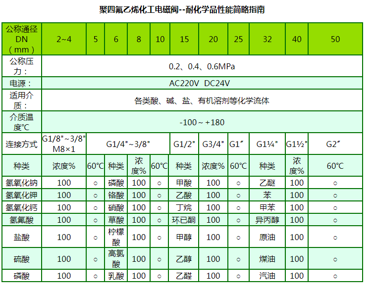 “禹成牌”化工電磁閥由于啟閉原理的獨(dú)特性和結(jié)構(gòu)設(shè)計(jì)的科學(xué)性,產(chǎn)品的所有部件均可根據(jù)不同的化學(xué)介質(zhì)選用不同的高分子材料制造,同時(shí)由于它的先導(dǎo)孔和卸壓孔是傳統(tǒng)閥的幾十倍大,復(fù)位彈簧設(shè)置在介質(zhì)外,因此它具有不易堵塞、耐酸堿、抗腐蝕和使用壽命長(zhǎng)等優(yōu)點(diǎn),可適應(yīng)于各種化學(xué)流體介質(zhì),是化工流體自動(dòng)化生產(chǎn)設(shè)備的最佳配套產(chǎn)品。