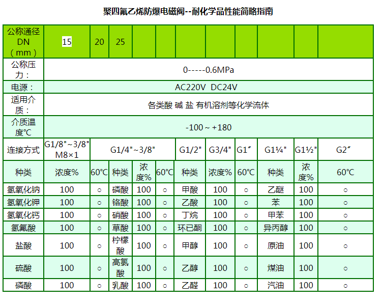 聚四氟乙烯化工電磁閥具有優(yōu)異的耐腐蝕性能,對(duì)所有的常用化學(xué)品都呈惰性。幾乎可以抵抗所有化學(xué)介質(zhì)(包括濃硫酸和王水)。具有優(yōu)異的耐熱性能,應(yīng)用溫度為-100~180℃,材料可長(zhǎng)期在230~260℃下工作。特別適合腐蝕嚴(yán)重、溫度高且化學(xué)品不允許與潤(rùn)滑劑接觸的環(huán)境,及易燃易爆環(huán)境使用.