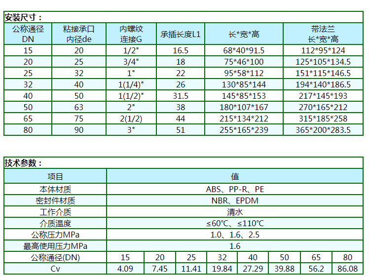 本產(chǎn)品民用系列選用國(guó)際通用型食品級(jí)工程塑料(ABS、PP-R、PE等)注造。工業(yè)用系列選用進(jìn)口阻燃型高強(qiáng)度工程塑料(PC等)注造。產(chǎn)品具有重量輕、耐腐蝕、不生銹、不結(jié)垢、導(dǎo)冷不結(jié)霜、導(dǎo)熱系數(shù)低,絕緣性能好,環(huán)保衛(wèi)生等優(yōu)點(diǎn)。啟閉原理上:采用浮動(dòng)閥芯,利用流體壓力差,誘導(dǎo)式啟閉的專利技術(shù)成果。因啟閉時(shí)無(wú)磨損(屬接觸型啟閉),而解決了傳統(tǒng)閥門因強(qiáng)制性啟閉而造成的啟閉部件和密封件磨損所引起的“跑、冒、滴、漏”的歷史性難題。它具有安裝使用方便,節(jié)能節(jié)水效果顯著(可節(jié)約傳統(tǒng)閥門的外泄內(nèi)漏所浪費(fèi)掉的水),使用壽命長(zhǎng)及物美價(jià)廉等特點(diǎn)。
